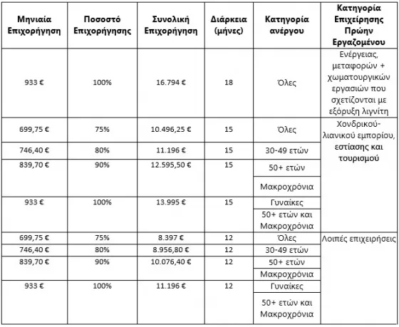 Η διάρκεια του προγράμματος είναι 12-18 μήνες, το ποσοστό επιχορήγησης μισθού και εισφορών κυμαίνεται μεταξύ 75-100%, ενώ το ποσό επιχορήγησης κυμαίνεται από 700 έως 933 ευρώ μηνιαία και από 8.397 έως 16.794 ευρώ συνολικά, ανάλογα με την κατηγορία του ανέργου και του κλάδου της επιχείρησης που εργαζόταν. Στην επιχορήγηση του μισθολογικού και μη μισθολογικού κόστους συμπεριλαμβάνονται δώρα εορτών και επίδομα αδείας.