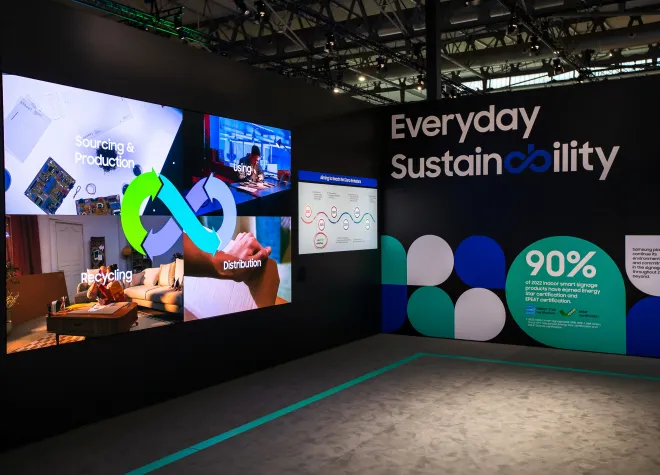Στην έκθεση ISE φέτος, η Samsung θα παρουσιάσει τις πρωτοβουλίες βιωσιμότητας της εταιρείας με βάση τη νέα περιβαλλοντική στρατηγική της που ανακοινώθηκε τον Σεπτέμβριο του 2022. Οι προεγγεγραμμένοι επισκέπτες θα μπορούν να δουν το περιβαλλοντικό όραμα της Samsung να ζωντανεύει, με τη ζώνη βιωσιμότητας στο περίπτερο να παρουσιάζει τις οικολογικές πρακτικές που εφαρμόζονται σε προϊόντα ψηφιακής σήμανσης. Αυτές οι πρακτικές βασίζονται στα πέντε στάδια του κύκλου ζωής του προϊόντος – προμήθεια, παραγωγή, διανομή, χρήση και ανακύκλωση.