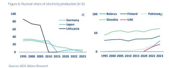 Πιο αναλυτικά, όπως επισημαίνει η Allianz Research, η πυρηνική ενέργεια ανεβάζει μομέντουμ, με αρκετές χώρες να δεσμεύονται να κατασκευάσουν νέες μονάδες για να αυξήσουν σημαντικά τη δυναμικότητα.