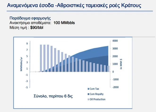 Σύμφωνα με τις επίσημες εκτιμήσεις του υπουργείου Περιβάλλοντος και Ενέργειας κατά την περίοδο υπογραφής των συμβάσεων παραχώρησης περιοχών της Δυτικής Ελλάδας για έρευνες, για κάθε 100 εκατομμύρια βαρέλια πετρελαίου και με υπόθεση για την τιμή του πετρελαίου στα 90 δολάρια το βαρέλι, το Δημόσιο εισπράττει 6 δισεκ. ευρώ. Σημειώνεται ότι η εκτίμηση για ύπαρξη αποθεμάτων αυτού του μεγέθους θεωρείται μετριοπαθής καθώς, ενδεικτικά, η περιοχή του Πρίνου έχει παράξει ως τώρα 120 εκατ. βαρέλια ισοδύναμου πετρελαίου.