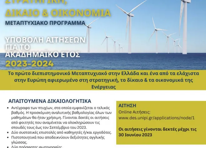 Προκηρύχθηκε ο νέος κύκλος σπουδών (2023-2024) του αγγλόφωνου διεπιστημονικού Μεταπτυχιακού Προγράμματος MSc in Energy: Strategy, Law & Economics, στο Τμήμα Διεθνών & Ευρωπαϊκών Σπουδών του Πανεπιστημίου Πειραιώς. Πρόκειται για το πρώτο διεπιστημονικό Μεταπτυχιακό στην Ελλάδα και ένα από τα πιο καινοτόμα στην Ευρώπη αφιερωμένο στη Στρατηγική, το Δίκαιο και τα Οικονομικά της Ενέργειας.