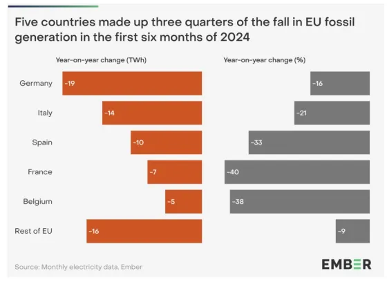 Την ίδια ώρα, τα ορυκτά καύσιμα παρήγαγαν 17% λιγότερο (-71 TWh) το πρώτο εξάμηνο του 2024 σε σύγκριση με την ίδια περίοδο του 2023, πέφτοντας στο 27% της παραγωγής (343 TWh). Ο άνθρακας μειώθηκε κατά ένα τέταρτο (-24%, -39 TWh) και το φυσικό αέριο κατά 14% (-29 TWh).