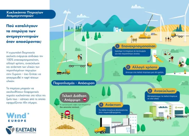 Το νέο ενημερωτικό έντυπο με θέμα τη βιώσιμη διαχείριση των πτερυγίων ανεμογεννητριών, αποτελεί προϊόν συνεργασίας με τον ευρωπαϊκό φορέα WindEurope και στοχεύει στην ανάδειξη των βέλτιστων πρακτικών για την κυκλικότητα στον αιολικό κλάδο.