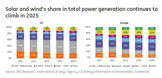 Η ING αναμένει ανανεωμένη δυναμική για τις εταιρείες του κλάδου να συνεχίσουν τις προσπάθειές τους να συμβαδίσουν με την αύξηση της ζήτησης το 2025. Αυτό οφείλεται στο ανταγωνιστικό κόστος, τη διαρκή εταιρική αγορά ενέργειας από ανανεώσιμες πηγές, τις δημοπρασίες ανανεώσιμων πηγών ενέργειας και την υπάρχουσα κρατική χρηματοδότηση. Η ανάπτυξη δυναμικότητας θα συνεχίσει να μεταφράζεται σε αυξημένη παραγωγή ενέργειας από ανανεώσιμες πηγές το 2025, καθώς τα περισσότερα έργα που βρίσκονται σε εξέλιξη με ασφαλείς συνδέσεις στο δίκτυο είναι απίθανο να αντιμετωπίσουν διαταραχές. Ο οίκος προβλέπει ότι το μερίδιο της ηλιακής και της αιολικής ενέργειας στο συνολικό μείγμα ενέργειας θα αυξηθεί πιθανότατα από 28% το 2024 σε 30% το 2025 στην ΕΕ και από 16% σε 18% κατά την ίδια περίοδο στις ΗΠΑ.