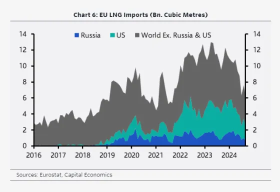 Από μακροοικονομική άποψη, το βασικό σημείο για τον βιομηχανικό τομέα της ΕΕ είναι ότι οι τιμές του φυσικού αερίου και κατ' επέκταση της ηλεκτρικής ενέργειας θα παραμείνουν σχετικά υψηλές στην Ευρώπη σε σύγκριση με τις ΗΠΑ τα επόμενα χρόνια, όπως σημειώνει η Capital Economics. Σίγουρα τιμή του φυσικού αερίου στην ΕΕ θα μειωθεί καθώς οι εγκαταστάσεις εξαγωγής LNG στις ΗΠΑ μπαίνουν σε λειτουργία και το υπερατλαντικό χάσμα τιμών δίνει κίνητρα για τη ροή του LNG προς τα ανατολικά πέρα από τον Ατλαντικό. Αλλά η άφθονη προσφορά φυσικού αερίου στις ΗΠΑ πιθανότατα θα περιορίσει τον βαθμό στον οποίο οι τιμές στις ΗΠΑ αυξάνονται – ιδιαίτερα εάν η παραγωγή αυξηθεί υπό τον Τραμπ.