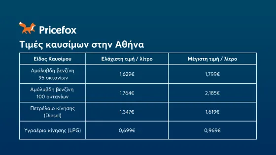 Το Pricefox, ο σύμβουλος σου στην εξοικονόμηση και η πλατφόρμα σύγκρισης τιμών ασφάλειας αυτοκινήτου, έκανε την έρευνα για εσένα και συγκέντρωσε το κόστος ανά λίτρο για τα εξής καύσιμα:
