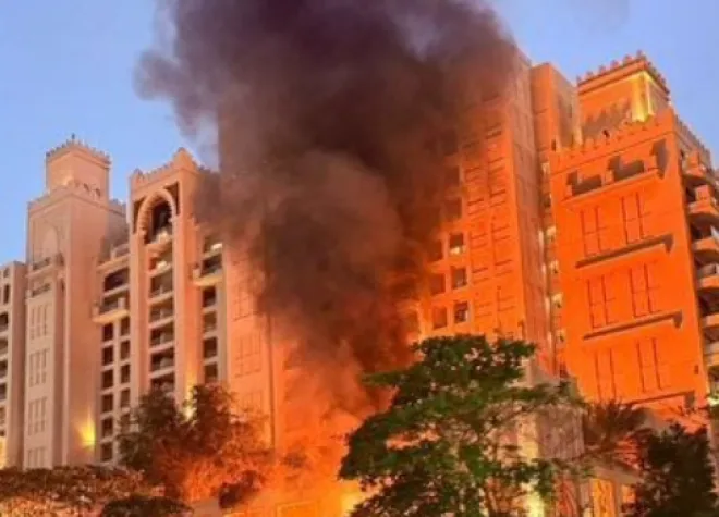 Φλόγες και καπνός φαίνονταν στο συγκρότημα ξενοδοχείων στο Palm, μία από τις πλέον τουριστικές και πολυτελείς περιοχές στο Ντουμπάι, έπειτα από επίθεση ιρανικού drone.