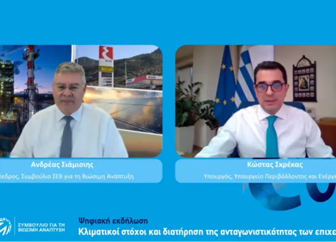 Με κεντρικό μήνυμα την αντιμετώπιση της κλιματικής αλλαγής με όρους προάσπισης της ανταγωνιστικότητας των επιχειρήσεων πραγματοποιήθηκε σήμερα (Τετάρτη 9 Μαρτίου 2022) η ψηφιακή εκδήλωση του Συμβουλίου του ΣΕΒ για τη Βιώσιμη Ανάπτυξη, με τίτλο: «Κλιματικοί στόχοι και διατήρηση της ανταγωνιστικότητας των επιχειρήσεων». Στην εκδήλωση παρουσιάστηκαν τα ευρήματα σχετικής μελέτης του ΙΟΒΕ και τοποθετήθηκαν εκπρόσωποι της πολιτικής ηγεσίας, καθώς και ευρωβουλευτές της Επιτροπής Περιβάλλοντος, Δημοσίας Υγείας και Τροφίμων (ENVI), που συμμετέχουν στη διαβούλευση της Ε.Ε. επί της δέσμης μέτρων «Fit for 55», με την οποία η Ε.Ε. φιλοδοξεί να πετύχει τους νέους κλιματικούς στόχους.