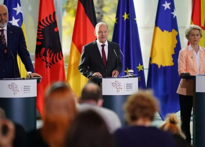 Ο Γερμανός καγκελάριος Όλαφ Σολτς και οι κορυφαίοι αξιωματούχοι της ΕΕ -Ούρσουλα φον ντερ Λάιεν και Σαρλ Μισέλ- ενώθηκαν με τους ηγέτες της Σερβίας, του Κοσσυφοπεδίου, της Βοσνίας-Ερζεγοβίνης, του Μαυροβουνίου, της Βόρειας Μακεδονίας και της Αλβανίας για τη Σύνοδο Κορυφής της Διαδικασίας του Βερολίνου.