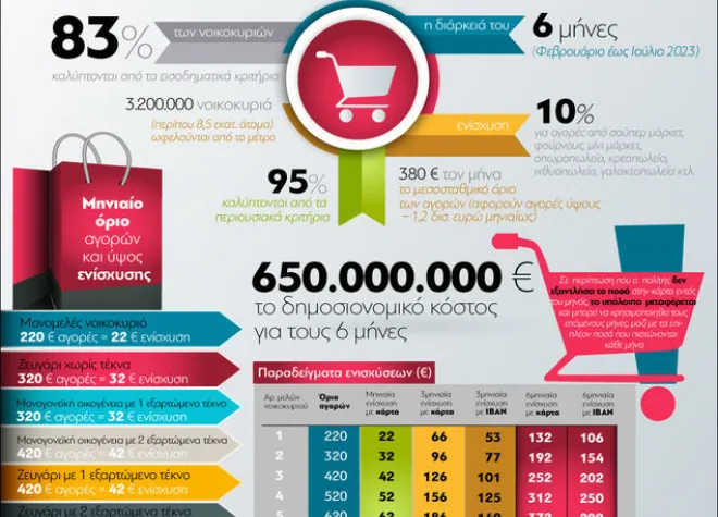 Το γράφημα αποτυπώνει στοιχεία για την ενίσχυση ύψους 10% που θα δοθεί από τον Φεβρουάριο και για έξι μήνες, για αγορές νοικοκυριών σε σούπερ μάρκετ, φούρνους, μίνι-μάρκετ, οπωροπωλεία, κρεοπωλεία, ιχθυοπωλεία, γαλακτοπωλεία κτλ.