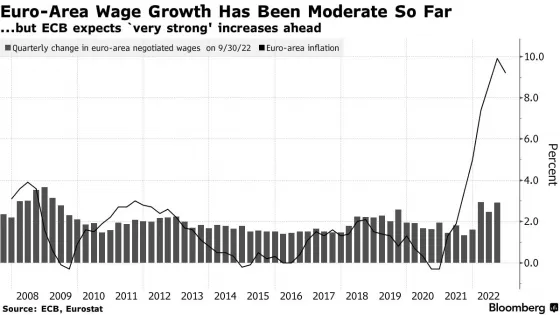 Οι αυξήσεις των μισθών αποτελούν βασικό δείκτη για το πού κατευθύνεται ο πληθωρισμός, τον οποίο η ΕΚΤ προσπαθεί να τιθασεύσει μέσω της επιτοκιακής της πολιτικής, έχοντας προχωρήσει σε μια άνευ προηγουμένου σειρά αυξήσεων επιτοκίων που ανέβασαν το επιτόκιο καταθέσεων στο 2% τον περασμένο μήνα.