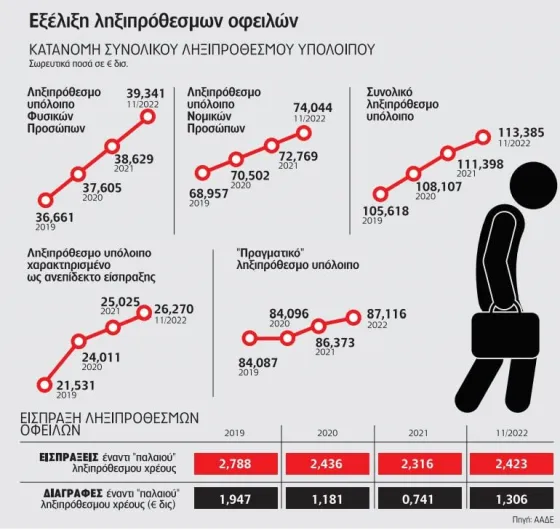 Επιπλέον θα πρέπει να σημειωθεί ότι όσοι οφείλουν ποσά πάνω από 100.000 ευρώ αντιμετωπίζουν ποινικές διώξεις και κυρώσεις που κυμαίνονται από ποινές φυλάκισης 1 έτους μέχρι και ποινές κάθειρξης 10 ετών, ανάλογα με το οφειλόμενο ποσό. Ειδικότερα σύμφωνα με τα στοιχεία της Ανεξάρτητης Αρχής Δημοσίων Εσόδων (ΑΑΔΕ) επί συνόλου 113,4 δισ. ευρώ ληξιπρόθεσμων οφειλών προς τη Φορολογική Διοίκηση τα 87,11 δισ. ευρώ θεωρούνται εύκολα ή δύσκολα εισπράξιμα. Εξ αυτών των ληξιπρόθεσμων όμως είναι ρυθμισμένα μόλις 5,3 δισ. ευρώ ή το 6% του θεωρούμενου ως εισπράξιμου υπολοίπου.