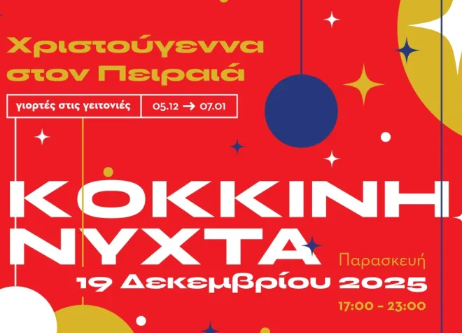 Αύριο έως τις 11:00 το βράδυ, Παρασκευή 19 Δεκεμβρίου, η αγορά του Πειραιά φορά τα γιορτινά της και «ντύνεται» στα κόκκινα, προσκαλώντας κατοίκους και επισκέπτες σε μια ξεχωριστή χριστουγεννιάτικη βόλτα για διασκέδαση και αγορές.