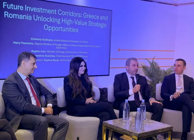 Στη σχετική συζήτηση, που πραγματοποιήθηκε την Πέμπτη 22 Ιανουαρίου 2026, με θέμα τους επενδυτικούς διαδρόμους τους μέλλοντος και τον ρόλο της Ελλάδας και της Ρουμανίας στη δημιουργία στρατηγικών ευκαιριών υψηλής αξίας, συμμετείχαν ο Υφυπουργός Εξωτερικών κ. Χάρης Θεοχάρης, ο Υπουργός Ενέργειας της Ρουμανίας, κ. Bogdan Ivan και η Πρέσβης των ΗΠΑ στην Αθήνα, κυρία Kimberly Guilfoyle, υπό τον συντονισμό της δημοσιογράφου, κυρίας Daphne Barak.