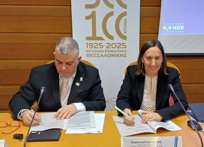 Μνημόνιο συνεργασίας για την ενθάρρυνση και ανάπτυξη της επιχειρηματικότητας, μέσω στοχευμένων χρηματοδοτικών εργαλείων, υπέγραψαν ο πρόεδρος του Βιοτεχνικού Επιμελητηρίου Θεσσαλονίκης (ΒΕΘ), Μάριος Παπαδόπουλος, και η διευθύνουσα σύμβουλος της Ελληνικής Αναπτυξιακής Τράπεζας (HDB), Ισμήνη Παπακυρίλλου, στις εγκαταστάσεις του Επιμελητηρίου.