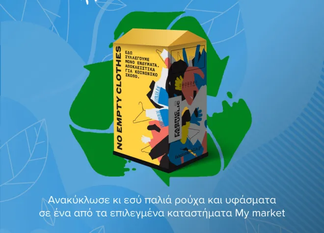 Η εξοικονόμηση φυσικών πόρων και η προώθηση της κυκλικής οικονομίας αποτελούν σημαντικούς στόχους Βιώσιμης Ανάπτυξης. Σύμφωνα με έρευνες ο μέσος Ευρωπαίος πετάει 15 κιλά ρούχα τον χρόνο, ενώ το 85% των ρούχων καταλήγουν σε χωματερές. Τα My market, πιστά στη δέσμευσή τους για την προστασία του περιβάλλοντος, υιοθετούν πρωτοβουλίες και δράσεις για την επιστροφή αξίας στην κοινωνία.