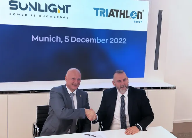 Η συμφωνία εξαγοράς υπογράφηκε στις 5 Δεκεμβρίου 2022 στο Μόναχο από τον Λάμπρο Μπίσαλα, Διευθύνοντα Σύμβουλο της Sunlight Group, και τον Martin Hartmann, Διευθύνοντα Σύμβουλο της Triathlon Holding GmbH. Σε συνέχεια και της τυπικής έγκρισης της συναλλαγής από τις αρμόδιες επιτροπές ανταγωνισμού, θα ολοκληρωθεί η εξαγορά από τη Sunlight Group του 51% του μετοχικού κεφαλαίου της Triathlon Holding GmbH. Η εταιρεία Geraer Batterie Dienst GmbH, μέχρι πρότινος βασικός μέτοχος της Triathlon, θα διατηρήσει το 49% της εταιρείας, και ο κ. Hartmann θα παραμείνει στη θέση του Διευθύνοντος Συμβούλου, ενώ η Sunlight θα εκπροσωπείται κατά πλειοψηφία στο Διοικητικό Συμβούλιο της Triathlon. Οι δύο εταιρείες θα συνεχίσουν την αυτόνομη επιχειρηματική λειτουργία τους και ταυτόχρονα θα αναζητήσουν συνέργειες σε υφιστάμενους αλλά και νέους τομείς δραστηριότητας, για να μεγιστοποιήσουν τις προσπάθειές τους να εξυπηρετήσουν την παγκόσμια αγορά.