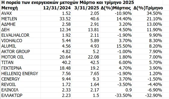 Πρώτη σε απόδοση μετοχή το πρώτο τρίμηνο του 2025 από τον ευρύτερο κλάδο της ενέργειας, των κατασκευών και των υποδομών ήταν η AVAX που ενισχύθηκε κατά 34,50%, μολονότι διόρθωσε κατά 10,90% το Μάρτιο. Η Metlen είχε άνοδο 21,10% το πρώτο τρίμηνο, πετυχαίνοντας αλλεπάλληλα ιστορικά υψηλά, ενώ το Μάρτιο ενισχύθηκε κατά 14,40%.