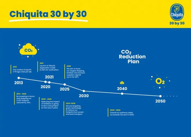 Το 2021, η Chiquita εγκαινίασε την πρωτοβουλία «30BY30», ένα σημαντικό πρόγραμμα που αποσκοπεί στην μείωση των εκπομπών διοξειδίου του άνθρακα της εταιρείας κατά 30% μέχρι το τέλος του 2030, και μέσα από το οποίο η εταιρεία αναγνωρίζει την μεγάλη απειλή που επιφέρει η κλιματική αλλαγή στις καλλιέργειες μπανάνας, τις αγροτικές κοινότητες και τον πλανήτη.