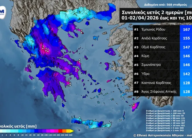 Στην Πελοπόννησο, την Ανατολική Στερεά και Εύβοια, τη Θεσσαλία, τη Χαλκιδική, τα Επτάνησα, τις Κυκλάδες, τη Ρόδο και σε νησιά του Κεντρικού και Ανατολικού Αιγαίου καταγράφονται τα μεγαλύτερα ύψη βροχής από χθες έως και σήμερα στις 10:00 , όπως αναφέρει το ΜΕΤΕΟ/Εθνικό Αστεροσκοπείο Αθηνών (ΕΑΑ).