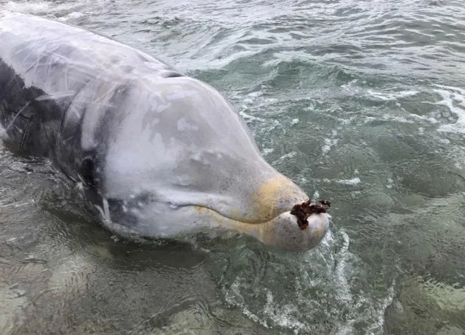 Με επιτυχία ολοκληρώθηκε η διαδικασία διάσωσης και της τρίτης ραμφοφάλαινας (Ziphius cavirostris), που εκβράστηκε σήμερα στις 9 το πρωί σε αβαθή νερά στο βραχώδες τμήμα της ακτής του Αγίου Γόρδιου, στη νοτιοδυτική πλευρά του νησιού.