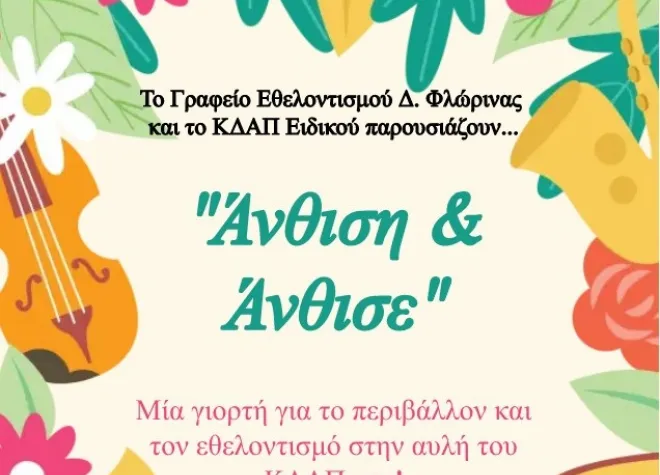 Γιορτή εθελοντισμού και και περιβάλλοντος με τίτλο “Άνθιση και Άνθισε” διοργανώνει το Γραφείο Εθελοντισμού Δήμου Φλώρινας και το ΚΔΑΠ Ειδικού, την Πέμπτη 22 Ιουνίου 2023 στις 10:30 το πρωί στην αυλή του ΚΔΑΠ Ειδικού και 5ου Δημοτικού Σχολείου.