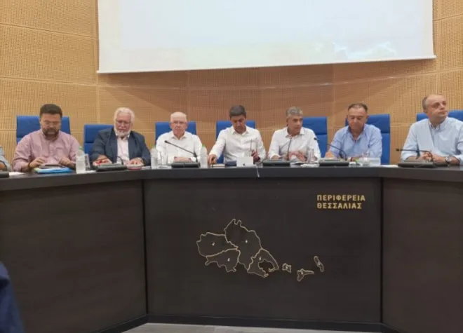 Στη σύσκεψη που διεξάγεται στην αίθουσα συνεδριάσεων του Περιφερειακού Συμβουλίου Θεσσαλίας, τον υπουργό πλαισιώνουν οι βουλευτές Λάρισας της ΝΔ Χρ. Κέλλας, Χρήστος Καπετάνος και Μάξιμος Χαρακόπουλος και ο περιφερειάρχης Κ. Αγοραστός.